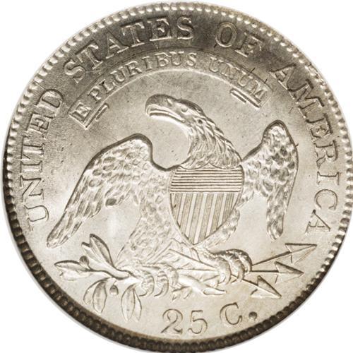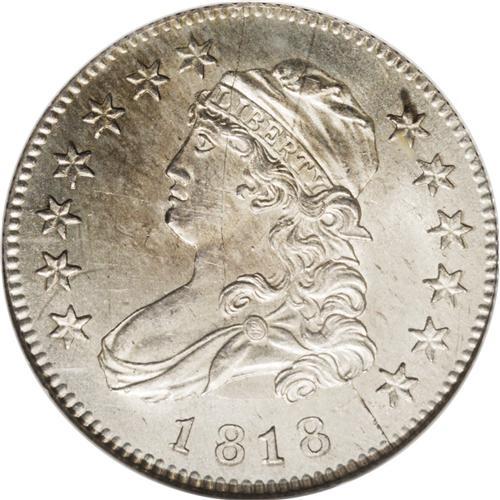 <B>1818<25C> MS65 NGC.</B></I> B-4, R.2. This needle-sharp Gem offers delicate golden-brown and cream-gray toning. Luster bathes the generally smooth surfaces. The reverse, on its own merits, is nearly pristine. The obverse is also smooth, as befits the grade, with the exception of moderate marks near the chin and on the cheek. Struck from multiply clashed dies, and bold die cracks bisect the portrait and pass through Liberty's shoulder and the D in UNITED. Aside from its dramatic die cracks, B-4 can be identified by the UNIT in UNITED, which are very close at the tops of the letters. Census: 26 in 65, 12 finer (6/06).
