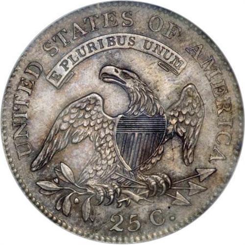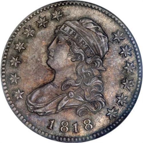 <B>1818 25C MS65 NGC.</B></I> B-5, R.5. Blended dove-gray, plum-mauve, and autumn-gold attest to the originality of this satiny and well struck Gem. Thorough evaluation with the aid of a loupe fails to find evenly remotely mentionable marks.<BR> The 1818 is an available date in circulated grades, courtesy of a few common varieties such as Browning-2. But even for B-2, Uncirculated examples are scarce. B-5 is a rare variety, and a perusal of our auction archives reveals the highest prices realized ($1,955) was for an NGC XF45. The present coin is twenty points finer, and should merit a sizeable premium over type. NGC has certified six 1818 quarters as B-5. The second finest is graded XF45.<BR><BR><B>Coin Engraver:</B> John Reich<BR><BR><b>Shipping:</b> Coins & Currency (<a target="_blank" href="http://www.heritageauctions.com/common/shipping.php">view shipping information</a>)