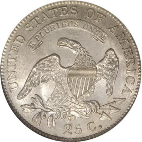 <B>1818 25C MS65 NGC.</B></I> B-4, R.2. On this variety, star 1 points between the upper two folds, and the 2 in 25 C has a curved base. B-4 can also be identified by the UNIT in UNITED, which are very close at the tops of the letters. This needle-sharp Gem offers delicate golden-brown and cream-gray toning, and luster bathes the generally smooth surfaces. Well preserved for the most part, with the exception of moderate marks on the chin, cheek and adjacent field. A bold vertical die crack bisects the portrait, another passes through Liberty's shoulder, and another goes though the D in UNITED. Census: 26 in 65, 13 finer (7/07).<BR><BR><B>Coin Engraver:</B> John Reich<BR><BR><b>Shipping:</b> Coins & Currency (<a target="_blank" href="http://www.heritageauctions.com/common/shipping.php">view shipping information</a>\)
