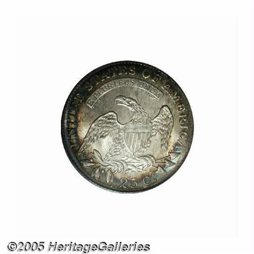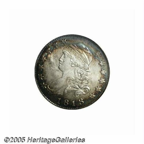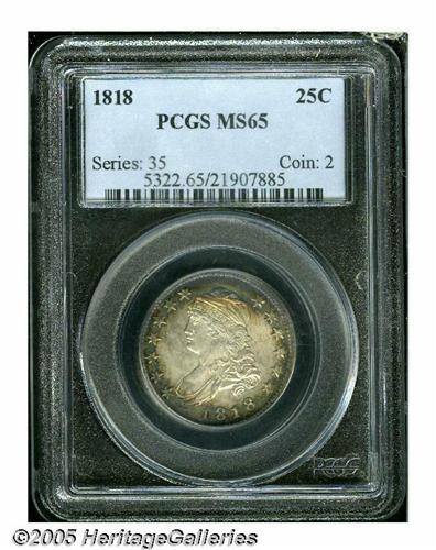 <B>1818<25C> MS65 PCGS.</B></I> B-2, R.1. Star 13 repunched; Scroll ends: below center of upright of D, center of right base of A. Another in an unprecedented multiple offering of Gem 1818 Quarters, this frosty, boldly struck representative is notable crescents of multicolored toning that almost totally surround essentially brilliant centers. Not even a few trivial luster grazes on the obverse appreciably take away from the appeal of this high quality example. Population: 14 in 65, 4 finer (6/05).