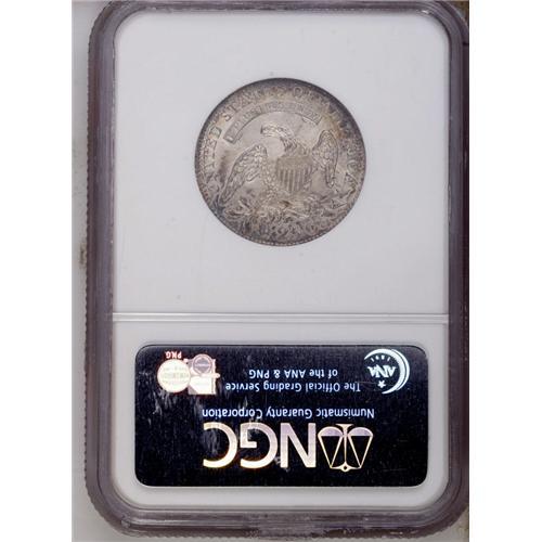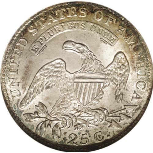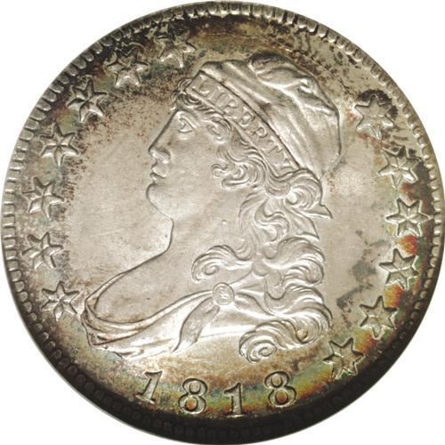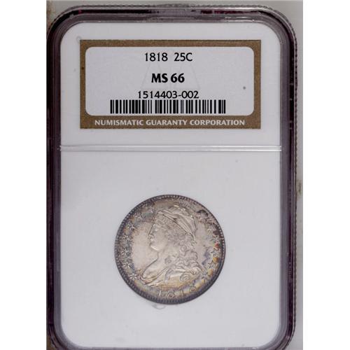 <B>1818<25C> MS66 NGC.</B></I> B-2, R.1. Die State II. This variety is easily spotted by the wide date, stars close to the border, and the lower left star that almost touches the second fold in the drapery. Three points of star 13 are repunched. A prominent center dot resides well below Liberty's ear.<BR> The Capped Bust coinage of John Reich was initially developed in 1807, beginning with the half dollar. According to the late Walter Breen, writing in his <I>Encyclopedia</B></I>: "Reich's new conception for the silver coins was an uncommonly buxom effigy of Ms. Liberty, wearing a mobcap inscribed with her name. (This was for generations misnamed a turban by people who never saw a real one; and even from the beginning it was taken to represent the <I>pilleus</B></I> or Phrygian liberty cap, whereas Reich actually intended it as a fashionable headdress, somewhat like that on some portraits of Martha Washington. Contemporaneous newspaper scurrility attacked the device as portraying 'the artist's fat mistress.' Reich placed it first on half dollars and half eagles, fall 1807; then quarter eagles (1808), dismes (1809), and finally quarter dollars, the next time banks ordered them (1815)."<BR> This example has bright centers, with speckled gold, turquoise, copper-brown, olive-drab and azure coloration at the rims. A bold die crack joins stars 7 through 10. Surface impairments are minuscule, consisting of a few shallow marks on Liberty's lower throat and upper chest areas. The mint luster is satiny but full, and the coin's striking details are simply excellent.<BR> Premium Gem survivors of coinage from this era are obviously very scarce, regardless of date or denomination. The 1818 quarter dollar is no exception, and the two major grading services combined have seen just 14 such coins, as of June, 2006, with two MS67s topping out the certified population data. Such high grade examples are