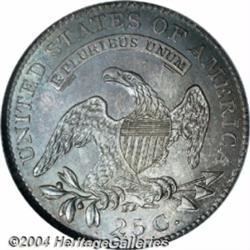 <table><tr><td><table><tr><td>1818 25C MS66 NGC. B-2, R.1. This is one of the more easily obtainable varieties of this Capped Bust Quarter production, but the awesome technical quality of this coin certainly sets it apart from most, if not all other representatives of this die marriage. This is a simply gorgeous Gem with richly toned, gray, green, gold, red, and blue surfaces. Both sides are frosty in texture with well centered, sharply defined features and only the lightest striking softness over the highpoints of Liberty's haircurls and the eagle's talons. With no mentionable abrasions, this coin is every bit the premium quality Gem. Population: 3 in 66, 1 finer (3/04). <BR><BR><B>Important notice:</B> Heritage usually auctions material at the rate of 200-250 lots per hour. On some occasions eBay Live bid software or the Internet may not be able to keep up with the pace of the auction. We recommend placing a realistic absentee bid now as insurance to avoid disappointment. Occasionally the auctioneer may eliminate or reject an eBay Live bid, and the auctioneer may also reopen a lot after the close of the eBay live bidding (usually because we missed an audience bid), and may reject your bid even if it shows you as the winning bidder. By bidding via eBay Live, you agree that Heritage may award the lot to another bidder at its sole discretion under the circumstances described above or any other reasonable circumstances. Since eBay bids are not shown to us until we open the lot on the floor, we treat those bids just like floor bids. In most cases the floor responds before the eBay bid is presented to us, due to Internet lag time, so for consistency we have made it a policy that floor bids are always considered first over tie eBay live bids. Also please note that all Heritage lots purchased through eBay Live carry a 20% Buyer's Premium. Please make sure you read the Terms and Conditions before you bid. <BR><BR><B>IMPORTANT ANNOUNCEMENT ABOUT RESERVES:</B> Heritage now divulges all reserves on its web site 7 days before every auction. If you want to know whether the reserve on this lot has been met, and if not, what the reserve amount is, please visit this lot page on the HeritageCoin.com web site, or email: bid@HeritageGalleries.com </span></font></td></tr></table></td></tr></table>
