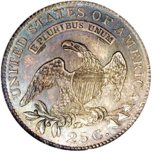 <B>1818 25C MS66 NGC.</B></I> B-2, R.1. This is one of the more easily obtainable varieties of this Capped Bust quarter production, but the awesome technical quality of this coin certainly sets it apart from most, if not all other representatives of this die marriage. This is a simply gorgeous Premium Gem with richly toned gray, green, gold, red, and blue surfaces. Both sides are frosty in texture with well centered, sharply defined features and only the lightest striking softness over the highpoints of Liberty's hair curls and the eagle's talons. There are no mentionable abrasions on this coin, destined for a fine type or date set. Population: 3 in 66, 1 finer (7/07).<BR><BR><B>Coin Engraver:</B> John Reich<BR><BR><b>Shipping:</b> Coins & Currency (<a target="_blank" href="http://www.heritageauctions.com/common/shipping.php">view shipping information</a>\)