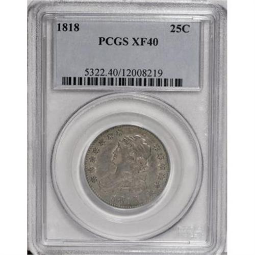 <B>1818 25C XF40 PCGS.</B></I> B-7, R.4. A well struck piece that shows light, even wear over silver-gray and green-gold surfaces. A small indentation appears between the bust and the date, but the fields and devices display few marks overall.<BR><BR><B>Coin Engraver:</B> John Reich<BR><BR><b>Shipping:</b> Coins & Currency (<a target="_blank" href="http://www.heritageauctions.com/common/shipping.php">view shipping information</a>)