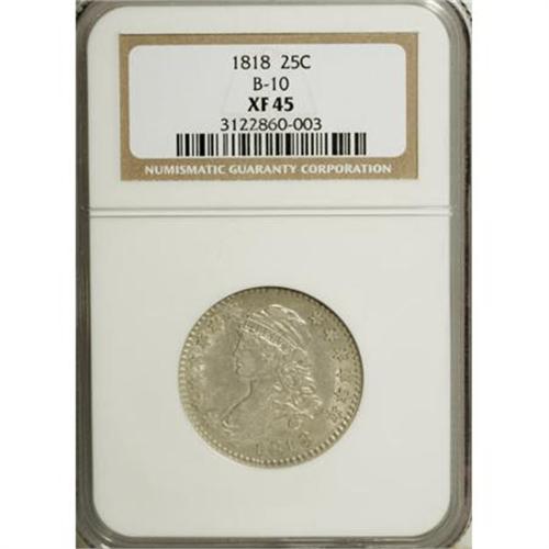 <B>1818 25C XF45 NGC.</B></I> B-10, R.3. This example has almond-gold toning and shimmering peripheral luster. Nearly unabraded aside from a cluster of faded marks beneath the left scroll end. Struck from boldly clashed dies.<BR><BR><B>Coin Engraver:</B> John Reich<BR><BR><b>Shipping:</b> Coins & Currency (<a target="_blank" href="http://www.heritageauctions.com/common/shipping.php">view shipping information</a>)