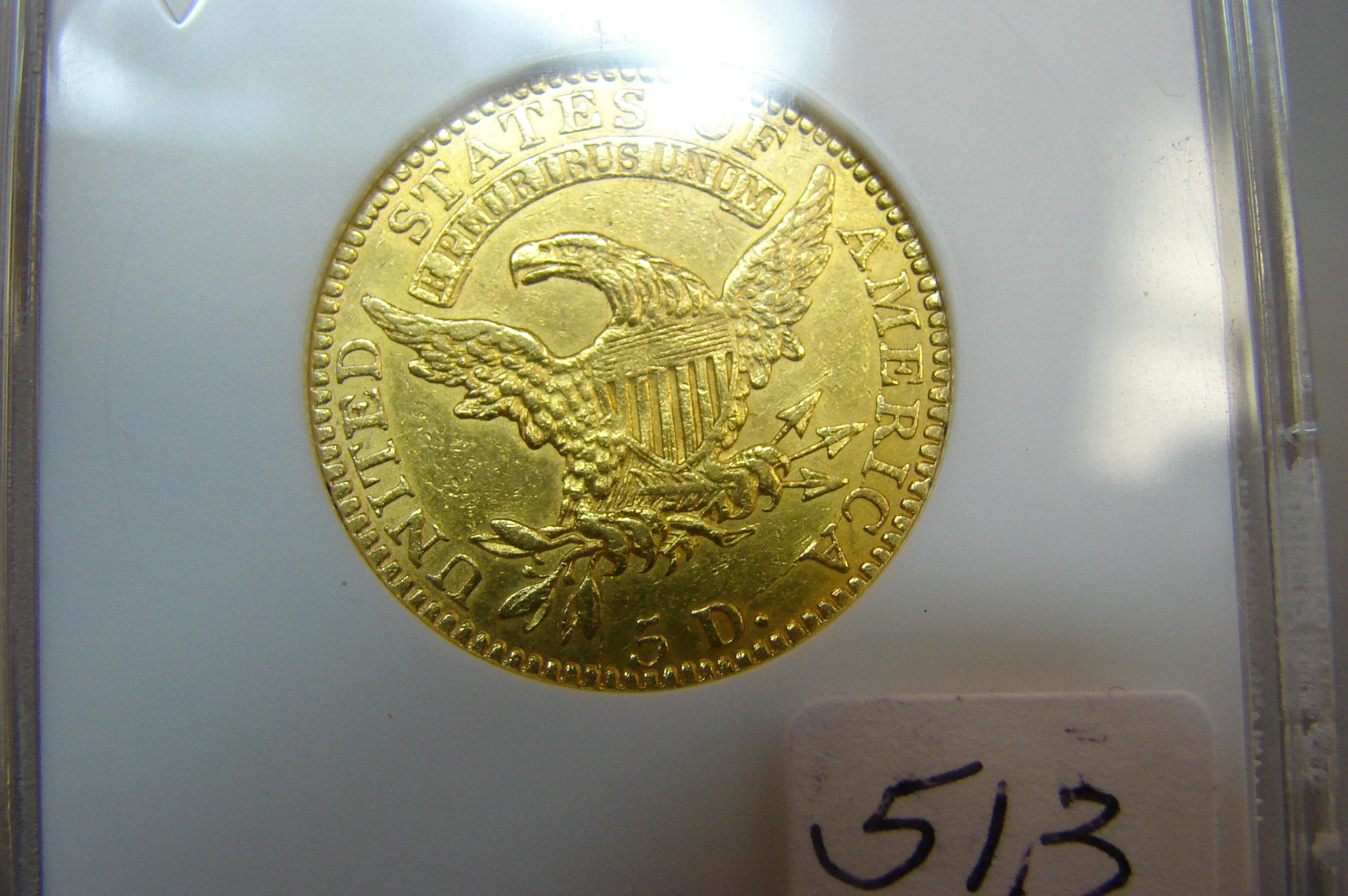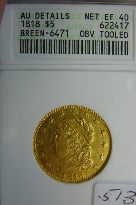 1818 $5.00 Gold Coin Breen-6471OBV Tooled ANACS AU Details Net EF 40