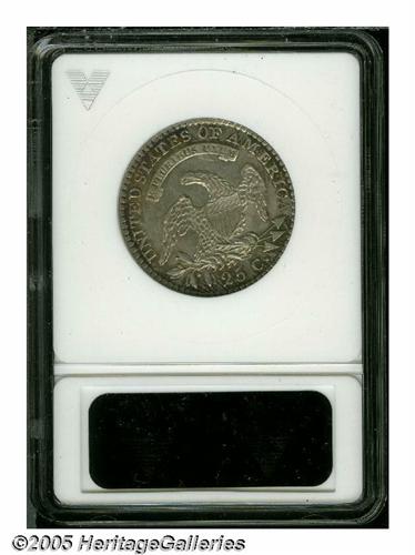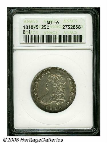 <B>1818/5<25C> AU55 ANACS.</B></I> B-1, R.2. Much of the flag from the digit 5 is visible inside the upper loop of the final 8. Sharply defined, with russet patina visiting the margins. The surfaces retain some luster, and are devoid of significant marks.<BR><I>From The Empire State Collection, Part Two.</B></I>
