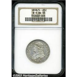1818/5 25C AU55 NGC. B-1, R.1. Generally a light gray with adequate luster surviving the recesses and faint signs of die clashing. A bit softly struck on highest curls of the portrait, while the early die state reverse is very well defined. This scarcer overdate which was caused, in part, by the Philadelphia Mint fire in 1815. Important notice: Heritage usually auctions material at the rate of 200-250 lots per hour. On some occasions eBay Live bid software or the Internet may not be able to keep up with the pace of the auction. We recommend placing a realistic absentee bid now as insurance to avoid disappointment. Occasionally the auctioneer may eliminate or reject an eBay Live bid, and the auctioneer may also reopen a lot after the close of the eBay live bidding (usually because we missed an audience bid), and may reject your bid even if it shows you as the winning bidder. By bidding via eBay Live, you agree that Heritage may award the lot to another bidder at its sole discretion under the circumstances described above or any other reasonable circumstances. Also please note that all Heritage lots purchased through eBay Live carry a 20% Buyer's Premium. Please make sure you read the Terms and Conditions before you bid.