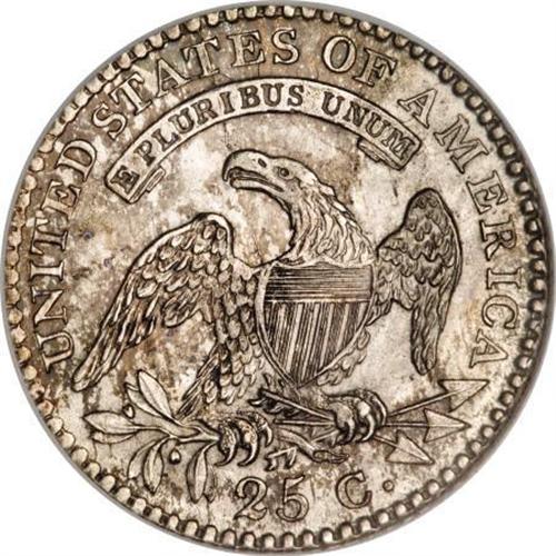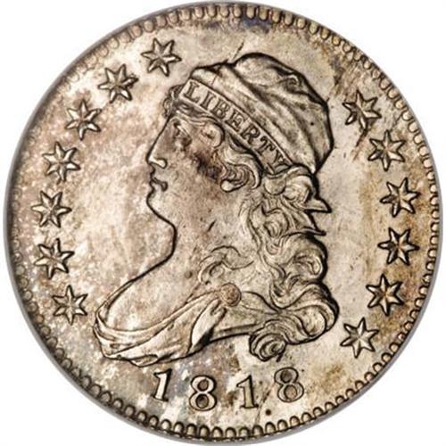 <B>1818/5 25C MS62 NGC.</B></I> B-1, R.2. This is an eye-catchingly lustrous coin, featuring a light layer of brown color above satin silver centers. Reasonably well struck, with fully defined dentils and lettering and a bit of weakness visible only on the highest points of the hair and on the wing to the left of the shield. Die clashing and at least one prominent die break are visible on the reverse, but contact marks appear to be at a minimum for the grade. The only overdate variety of the year, in demand due to its Guide<I> Book</B></I> listing.<BR><BR><B>Coin Engraver:</B> John Reich<BR><BR><b>Shipping:</b> Coins & Currency (<a target="_blank" href="http://www.heritageauctions.com/common/shipping.php">view shipping information</a>)