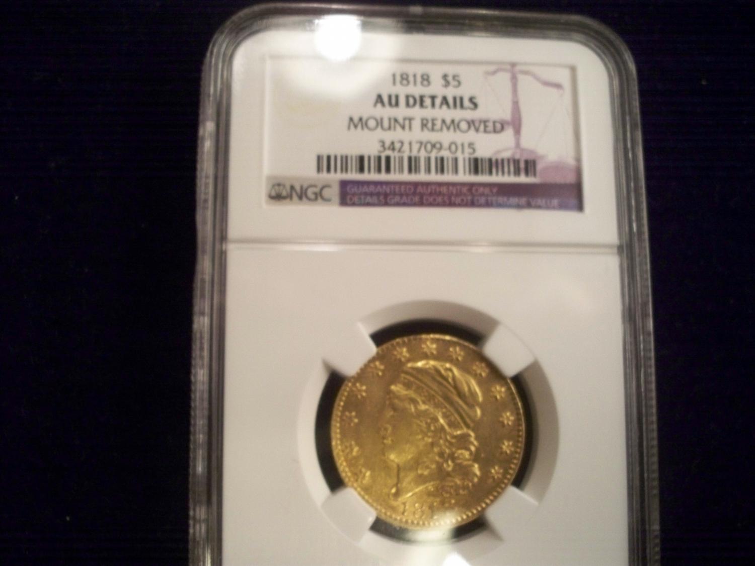 1818 $5 Gold Capped Head Liberty Coin, AU (Loop removed), ONLY 48,588 MINTED IN 3 TYPES