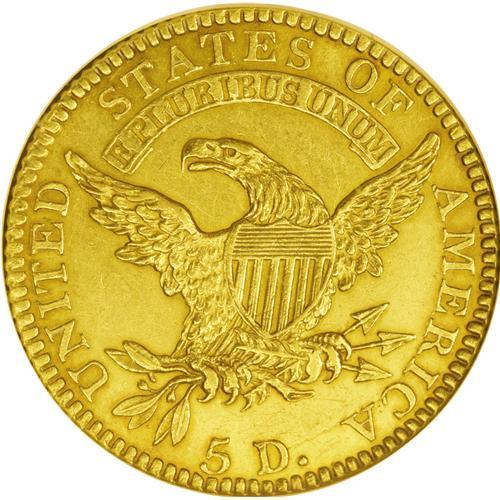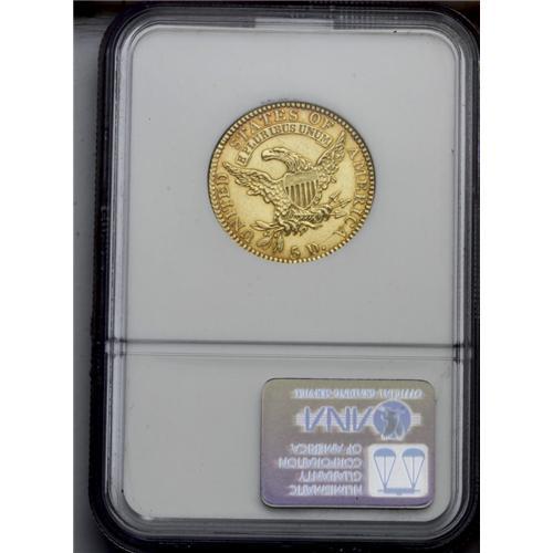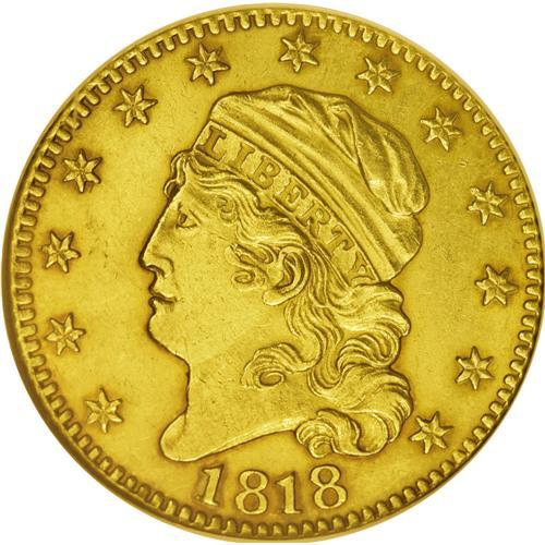 <B>1818<$5> MS60 NGC.</B></I> Breen-6471, B. 1-A, Miller-123, R.5. The half eagles of 1818 were created from three dies each for the obverse and reverse, each mated monogamously with a single partner. The obverse die from this pairing is unique in that it features a "scalloped" or notched inner point on every obverse star. This is a signature of recently (1817) departed Mint Engraver John Reich, who created a notched star punch that was normally used on the 13th star of obverse dies from 1807 through 1815. The present example offers surfaces that are a pale greenish-gold, with deeper copper-gold accents around the device edges. On the reverse a die crack runs from the D in the denomination through the bases of AMERICA. Some light adjustment marks are seen in the reverse center.<BR><I>From The Chief Paduke Collection.</B></I>