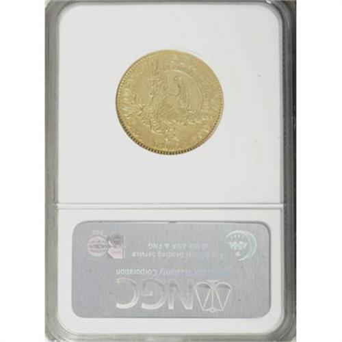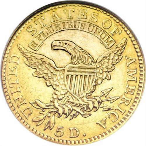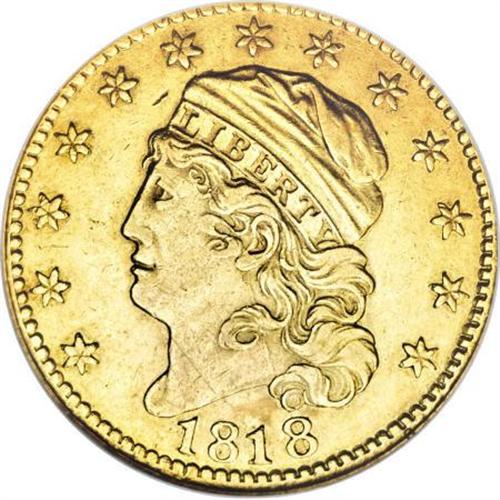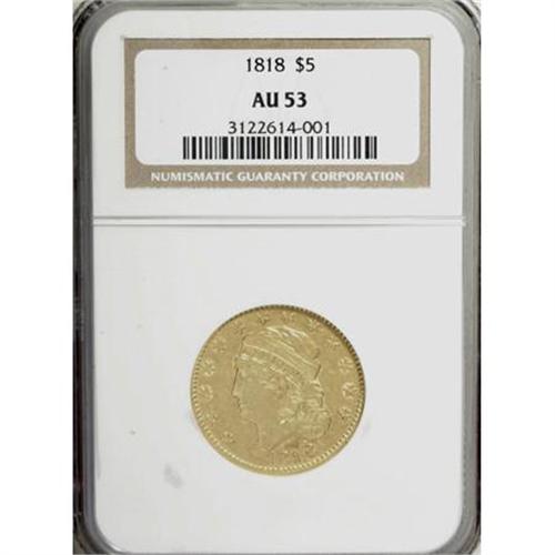 <B>1818 $5 STATESOF AU53 NGC.</B></I> Breen-6470, BD-2, R.4. A minor mint engraving blunder. The engraver spaced STAT too widely apart, then realized his error and crowded ESOF to prevent letters from reaching the eagle's right (facing) wingtip. From a later die state with a prominent bisecting vertical die crack from star 6 through the second 8 in the date. This straw-gold example is slightly subdued, but is richly detailed and possesses myriad remnants of its initial luster. Neither side has any mentionable marks. The dies are rotated, as usual for this popular variety.<BR><I>From The John Stimson, Sr. Collection, Part Two.</B></I><BR><BR><B>Coin Engraver:</B> John Reich<BR><BR><b>Shipping:</b> Coins & Currency (<a target="_blank" href="http://www.heritageauctions.com/common/shipping.php">view shipping information</a>)