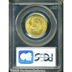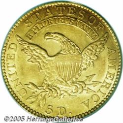 <B>1818 $5 STATESOF MS61 PCGS.</B></I> B. 2-B, Miller-124, High R.5. This is the first year of Robert Scot's slightly modified design. The STATESOF variety (the two words being run together) is widely recognized by specialists--it is the most "common" of the three major varieties of the year and yet as a date it is still considered "very rare" by Breen. Very elusive in Mint condition, this is an important offering for the advanced gold specialist. Sharply struck, save for a little central weakness, the green-gold surfaces retain good mint luster. Some diagonal, adjustment-like marks are seen on the obverse device, and there are very few abrasions on either side. About 45 degrees of clockwise die rotation is also noted.