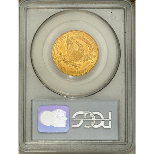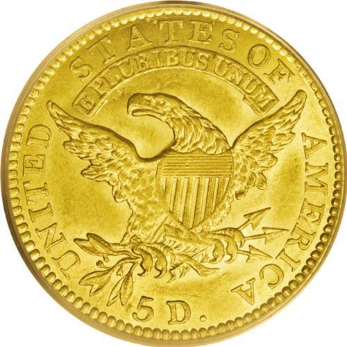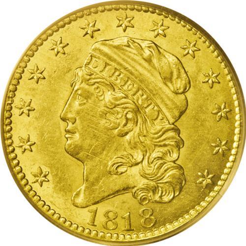 <B>1818<$5> STATESOF MS61 PCGS.</B></I> Breen-6470, B. 2-B, Miller-124, R.4. This is the first year of Robert Scot's slightly modified design. The STATESOF variety (the two words being run together) is widely recognized by numismatists. It is the most "common" of the three major varieties of the year, and yet as a date it is still considered "very rare" by Breen. Highly elusive in Mint State, this is an important offering for the advanced gold specialist. This piece is sharply struck, save for a little central weakness, and the green-gold surfaces retain good mint luster. Some diagonal adjustment marks are seen on the obverse device, and there are few abrasions on either side. About 45 degrees of clockwise die rotation is noted.<BR><I>From The Antigo Collection.</B></I>