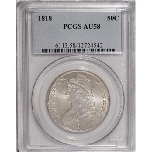 <B>1818 50C AU58 PCGS.</B></I> O-111, R.1. A tiny spike from the top of the cap identifies the Overton marriage. This lustrous representative has delicate gold toning and surprisingly few marks. The portrait has only a whisper of rub.<BR><BR><B>Coin Engraver:</B> John Reich<BR><BR><b>Shipping:</b> Coins & Currency (<a target="_blank" href="http://www.heritageauctions.com/common/shipping.php">view shipping information</a>)