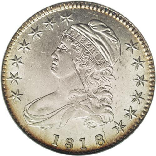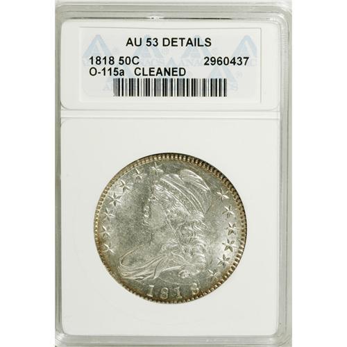 <B>1818 50C --Cleaned--ANACS. AU53 Details.</B></I> O-115a, High R.4. A seldom-seen variety identified by a bisecting obverse die crack from 11 to 5 o'clock. Although designated as "Cleaned" by ANACS, this piece is only slightly bright, and there are no obvious patches of hairlines. Luster dominates the borders and devices. A few moderate marks are noted near the profile.<BR><I>From The Hoosier Discovery Collection.</B></I><BR><BR><b>Shipping:</b> Coins & Currency (<a target="_blank" href="http://www.heritageauctions.com/common/shipping.php">view shipping information</a>)
