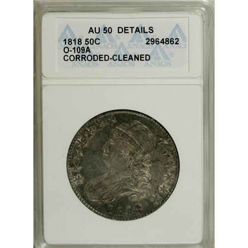 <B>1818 50C --Cleaned, Corroded--ANACS. AU50 Details.</B></I> O-109a. NGC Census: (34/263). PCGS Population (49/206). Mintage: 1,960,322. Numismedia Wsl. Price for NGC/PCGS coin in AU50: $233. (#6113)<BR><BR><b>Shipping:</b> Coins & Currency (<a target="_blank" href="http://www.heritageauctions.com/common/shipping.php">view shipping information</a>)