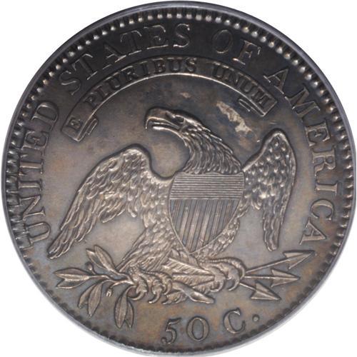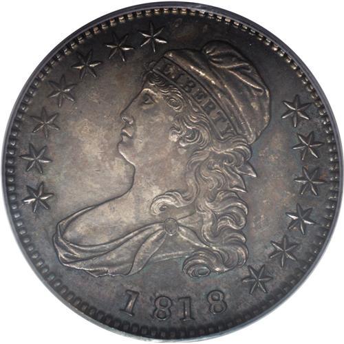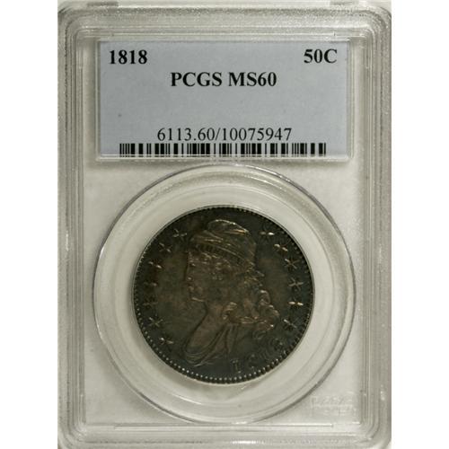 <B>1818 50C MS60 PCGS.</B></I> O-113, R.3. The date is spaced 1 81 8 on this die pairing, and star 1 shows prominent recutting, with two extra lower points. A small recutting mark appears to the left below the first 8. The arrowheads on the reverse are close and lightly connected by wispy die cracks. This piece appears undergraded, as there are few contact marks evident on either side. The luster is considerably subdued by deep smoke-gray toning, and the strike is fairly well executed, save for the eagle's claws.<BR><BR><b>Shipping:</b> Coins & Currency (<a target="_blank" href="http://www.heritageauctions.com/common/shipping.php">view shipping information</a>)