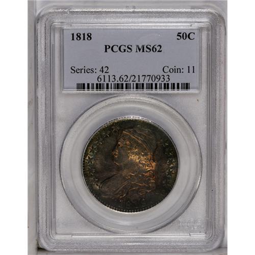 <B>1818<50C> MS62 PCGS.</B></I> O-107, R.1. Lustrous with peach, apricot, and plum toning. Nicely detailed for the issue, though small, shallow abrasions restrict the grade.