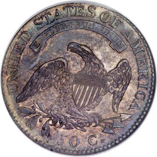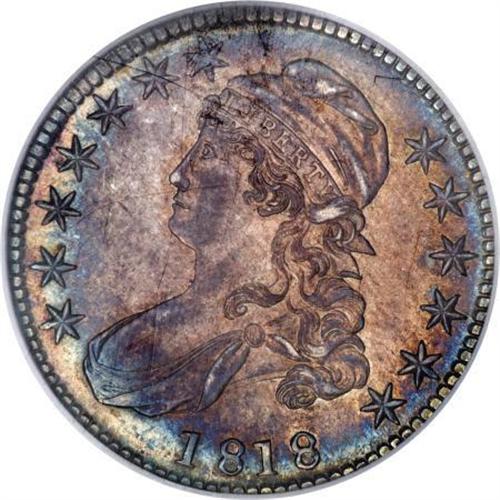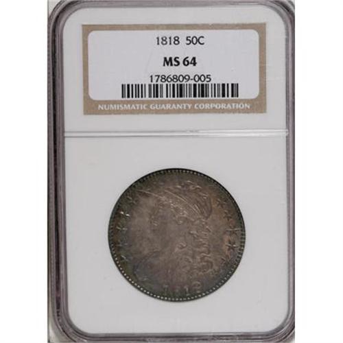 <B>1818 50C MS64 NGC.</B></I> O-112, R.1. A bold die line connects the bases of the IC in AMERICA, diagnostic for the Overton marriage. Deep golden-brown and ocean-blue compete for territory across this satiny and evenly struck near-Gem. The surfaces appear unabraded to the naked eye, and a loupe uncovers only subtle marks near star 3 and the eagle's head. <BR><BR><B>Coin Engraver:</B> John Reich<BR><BR><b>Shipping:</b> Coins & Currency (<a target="_blank" href="http://www.heritageauctions.com/common/shipping.php">view shipping information</a>)
