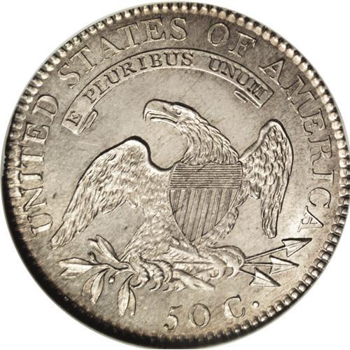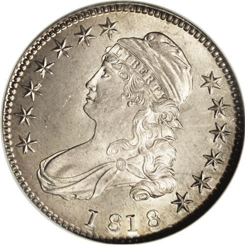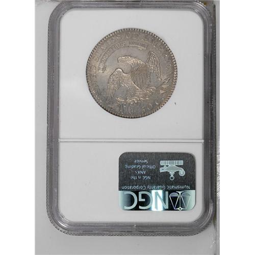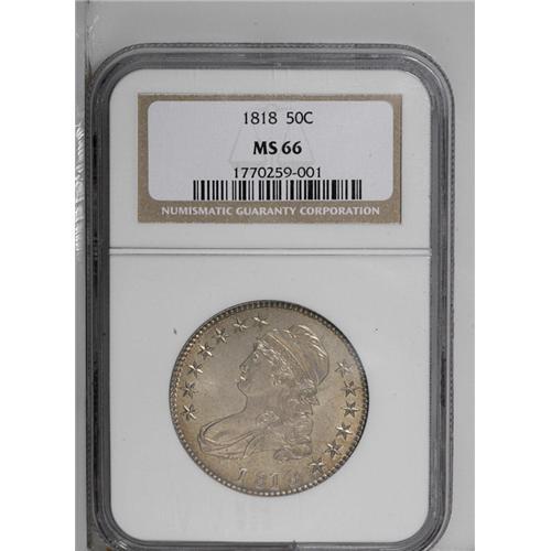 <B>1818<50C> MS66 NGC.</B></I> O-114, R.3. Star 1 is widely repunched, and this helps identify this relatively scarce die marriage. This magnificent Capped Bust half is delightfully toned in blended gold and silver-gray hues. The fully lustrous surfaces are flawless aside from a solitary hair-thin mark between star 1 and the bust tip. The strike is also impressive, since only the right (facing) claw lacks intricate detail. NGC population data for the 1818 is jumbled between figures for the date and by variety. Apparently, O-114a is more available than the earlier state O-114, since seven pieces have been certified for the former, while only a single example (not the present piece) is listed as O-114. None grade higher than MS62. As a date, without any variety specification, two pieces (including the present coin) have been certified as MS66, with none finer.