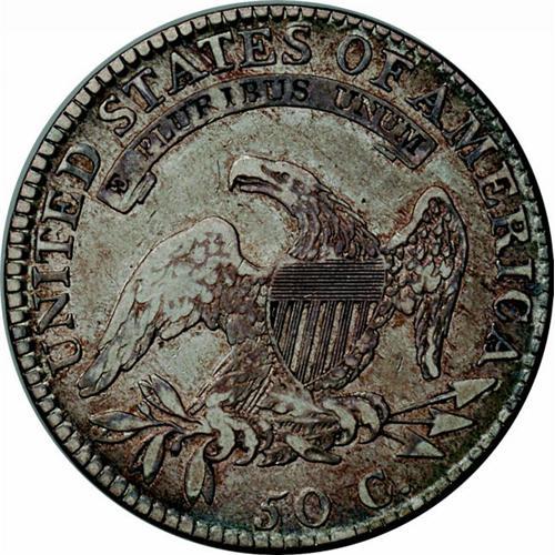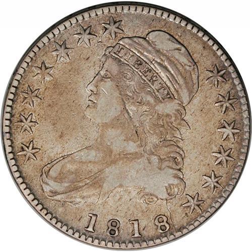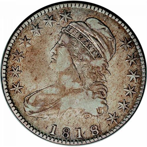 <B>1818<50C> VF20 NGC.</B></I> O-115a, High R.4. A large die crack extends from stars 6 and 7 down through Liberty, past the second 8 of the date, to 5 o'clock on the obverse rim. Another thin crack is seen from the drapery up inside the first three stars to stars 4, 5, and 6. A third crack curves up from the final 8 in the date across the bust into the field. The obverse die could not have lasted much longer after this impression. About 45 degrees of clockwise rotation is also noted. Medium gray patina is accented with rose-golden colorations.<BR><I>Ex: Roland Willasch (8/21/1985).</B></I> Envelope Included.