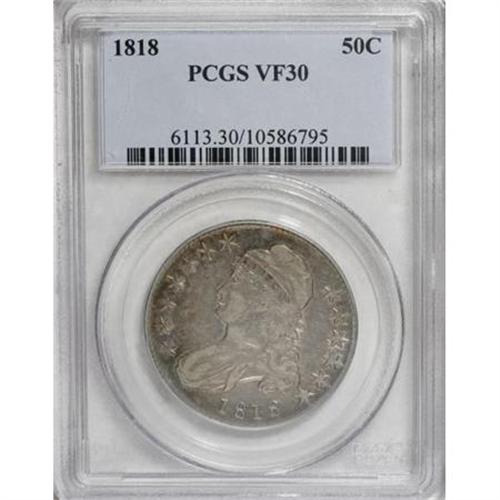 <B>1818 50C VF30 PCGS.</B></I> PCGS Population (13/343). NGC Census: (5/373). Mintage: 1,960,322. Numismedia Wsl. Price for NGC/PCGS coin in VF30: $108. (#6113)<BR><BR><B>Coin Engraver:</B> John Reich<BR><BR><b>Shipping:</b> Coins & Currency (<a target="_blank" href="http://www.heritageauctions.com/common/shipping.php">view shipping information</a>\)