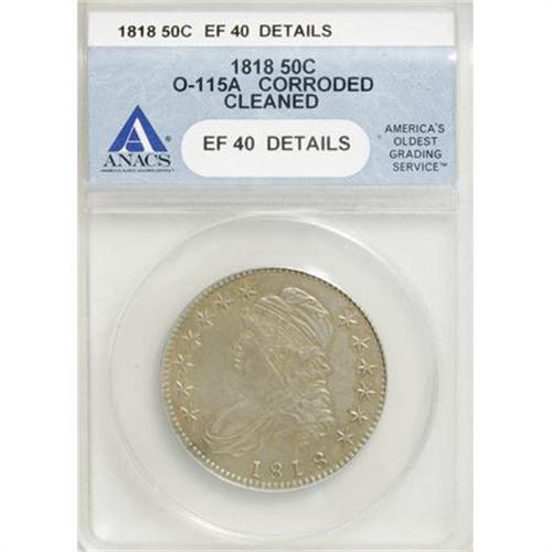 <B>1818 50C --Cleaned, Corroded--ANACS. XF40 Details.</B></I> O-115 a. NGC Census: (25/346). PCGS Population (28/308). Mintage: 1,960,322. Numismedia Wsl. Price for NGC/PCGS coin in XF40: $150. (#6113)<BR><BR><B>Coin Engraver:</B> John Reich<BR><BR><b>Shipping:</b> Coins & Currency (<a target="_blank" href="http://www.heritageauctions.com/common/shipping.php">view shipping information</a>)
