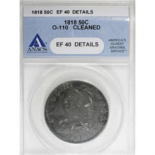<B>1818 50C --Cleaned--ANACS. XF40 Details.</B></I> O-110, R.4. This elusive Overton marriage is noted for its awkwardly entered date and a merged triple denticle above the R in AMERICA. Deep aquamarine patina embraces the obverse, while the reverse is golden-brown and lilac-gray. The obverse has been wiped, but the reverse remains attractive.<BR><BR><B>Coin Engraver:</B> John Reich<BR><BR><b>Shipping:</b> Coins & Currency (<a target="_blank" href="http://www.heritageauctions.com/common/shipping.php">view shipping information</a>)
