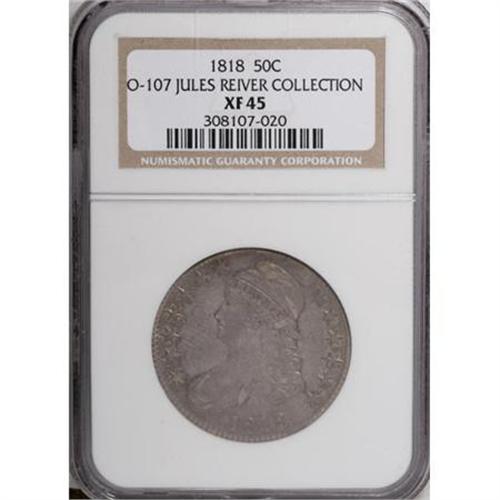 <B>1818 50C XF45 NGC.</B></I> O-107. Ex: Jules Reiver Collection. NGC Census: (43/303). PCGS Population (45/263). Mintage: 1,960,322. Numismedia Wsl. Price for NGC/PCGS coin in XF45: $194. (#6113)<BR><BR><B>Coin Engraver:</B> John Reich<BR><BR><b>Shipping:</b> Coins & Currency (<a target="_blank" href="http://www.heritageauctions.com/common/shipping.php">view shipping information</a>)