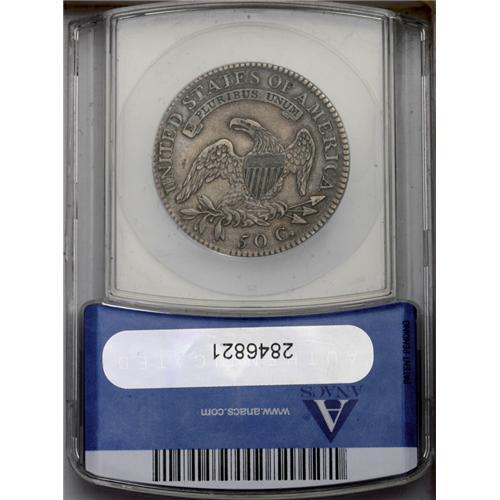 <B>1818/7<50C> Large 8 AU50 ANACS.</B></I> O-103, R.3. There is a die dot below RI in AMERICA. The first 8 in the date is larger than the second 8. A die crack extends from the rim through obverse star 11 and to Liberty's hair curl. Well struck and evenly worn, without mentionable marks on either side. An opaque layer of olive-drab toning covers most of the obverse and reverse surfaces. A scarcer variety of this popular <I>Guide Book</B></I> overdate.