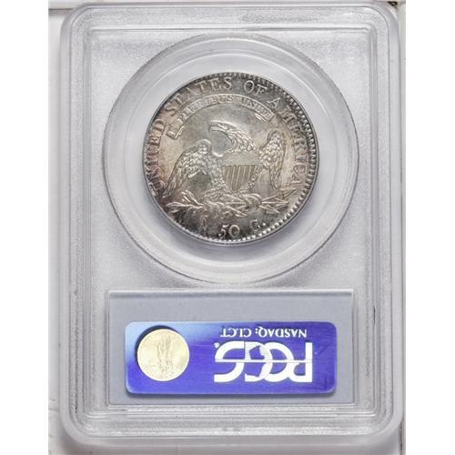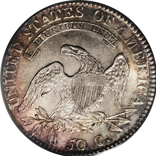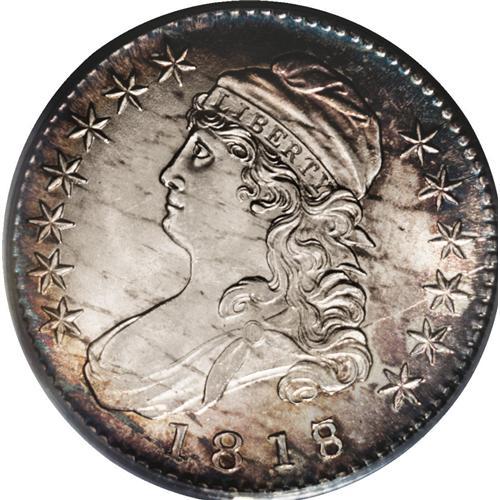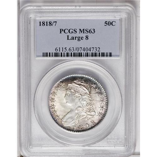 <B>1818/7<50C> Large 8 MS63 PCGS.</B></I> O-101, R.1. The crossbar of the 7 shows boldly above the top of the 8. A center dot shows on Liberty's neck. On the reverse UNITED is quite near the rim. This lustrous piece shows attractive silver centers with amber, blue, and champagne patina on the obverse. The reverse is champagne and silver. A small die break passes from the rim through star 11 and to the rear hair curls. This delectable piece has an overall appearance that could easily suggest a finer grade.
