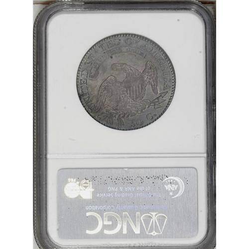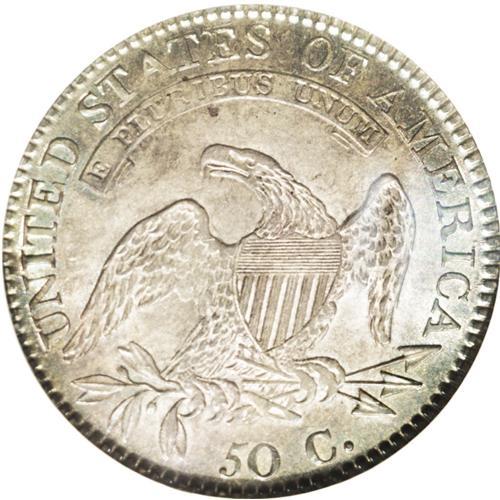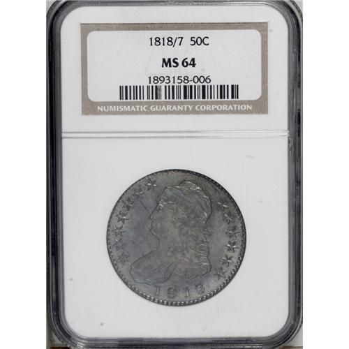 <B>1818/7<50C> Large 8 MS64 NGC.</B></I> O-101, R.1. An early die state and one of the finest offered in recent years. It has been four years since a finer example of this variety was offered, in our November 2002 Santa Clara auction. This lustrous near-Gem has pale grayish-gold color that is accented by light blue and iridescent toning. The surfaces are pristine and the design details are sharply defined.