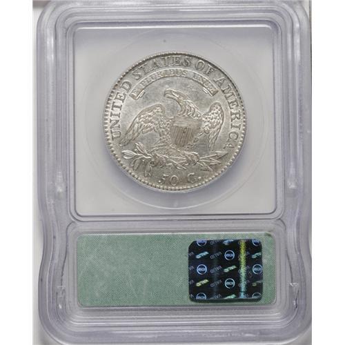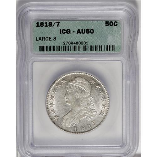<B>1818/7 50C Small 8 AU50 ICG.</B></I> O-102, R.2. Incorrectly labeled as a "Large 8" variety on the holder. This still-lustrous piece is well struck and has light blue-gray patina over each side. The overall eye appeal is strong.<BR><BR><b>Shipping:</b> Coin/Currency (<a target="_blank" href="http://www.heritageauctions.com/common/shipping.php">view shipping information</a>)