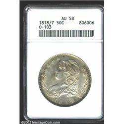 1818/7 50C Small 8 AU58 ANACS. O-103, R.3. Bright, lustrous surfaces with the lightest wear on the highest points. There is some golden and russet toning in front of the face and between the stars and rims on the obverse, as well as in the peripheries by the rims on the reverse. A very pleasing example of this popular overdate, with the top serif and bottom slant of the 7 boldly visible behind the 8. Important notice: We expect to be auctioning lots at the rate of 200-250 per hour. Sometimes eBay Premier live bid software cannot keep up with that pace, so we strongly recommend that you place a realistic proxy bid now as insurance to avoid disappointment. Also please note that all Heritage/CAA lots purchased through eBay Premier carry a 20% Buyer's Premium. Please make sure you read the Terms and Conditions.
