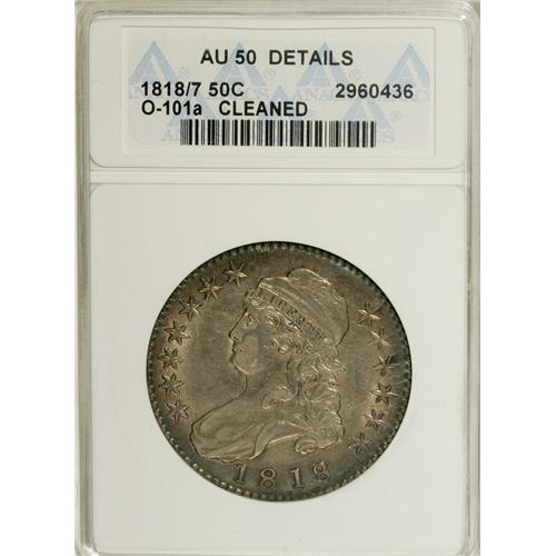<B>1818/7 50C Small 8--Cleaned--ANACS. AU50 Details.</B></I> O-168. NGC Census: (17/123). PCGS Population (10/41). Numismedia Wsl. Price: $525. (#6114)<BR><BR><b>Shipping:</b> Coins & Currency (<a target="_blank" href="http://www.heritageauctions.com/common/shipping.php">view shipping information</a>)