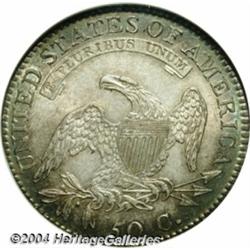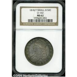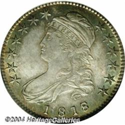<B>1818/7<50C> Small 8 MS62 NGC.</B></I> O-102, R.2. The peak of an underdigit 7 creates a pair of 'horns' atop the second 8 in the date. The only Small 8 overdate Overton variety, which merits its own <I>Guide Book</B></I> listing. Sea-green and golden-brown colors consume the borders and surround the dove-gray centers. A well struck and original Bust Half with shimmering luster and undisturbed surfaces. A prize for the alert specialist. NGC Overton-102 Population: 2 in 62, 3 finer (5/04).<BR><I>From The Frank O. Fredericks Collection, Part Five.</B></I> <BR><BR><B>Important notice:</B> Heritage usually auctions material at the rate of 200-250 lots per hour. On some occasions eBay Live bid software or the Internet may not be able to keep up with the pace of the auction. We recommend placing a realistic absentee bid now as insurance to avoid disappointment. Occasionally the auctioneer may eliminate or reject an eBay Live bid, and the auctioneer may also reopen a lot after the close of the eBay live bidding (usually because we missed an audience bid), and may reject your bid even if it shows you as the winning bidder. By bidding via eBay Live, you agree that Heritage may award the lot to another bidder at its sole discretion under the circumstances described above or any other reasonable circumstances. Since eBay bids are not shown to us until we open the lot on the floor, we treat those bids just like floor bids. In most cases the floor responds before the eBay bid is presented to us, due to Internet lag time, so for consistency we have made it a policy that floor bids are always considered first over tie eBay live bids. Also please note that all Heritage lots purchased through eBay Live carry a 20% Buyer's Premium. Please make sure you read the Terms and Conditions before you bid. </span></font></tr></table></td></tr></table>