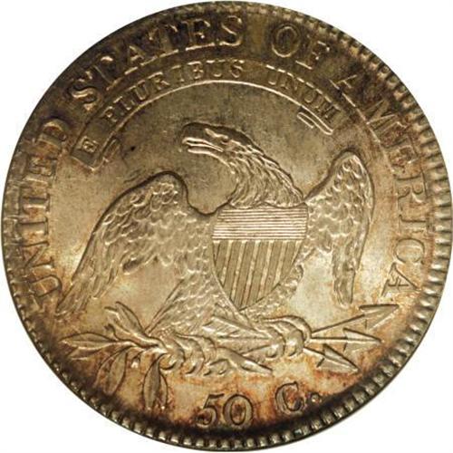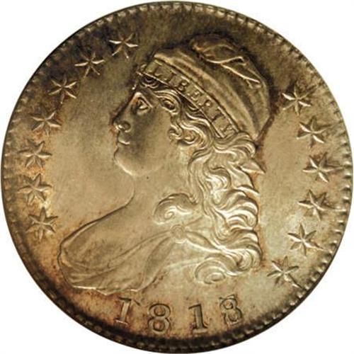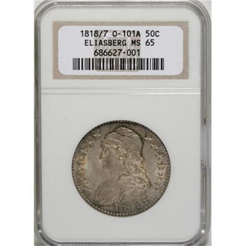 <B>1818/7 50C Large 8 MS65 NGC.</B></I> O-101a, R.1. Ex: Eliasberg. One of two overdates from this year, each of which is distinct and collectible, one with a large first 8 in the date and the other (O-102) with a small first 8. As expected from this die state, extended die cracks are seen on each side. This piece is listed in Stephen Herrman's <I>Prices Realized for Bust Half Dollars </B></I>as the finest known. The surfaces are lustrous and the blue-gray patina is accented with deep golden around the devices. Sharply struck in all areas except on the upper left (facing) wing, as indicated in the Eliasberg catalog.<BR><I>Ex: George H. Earle Collection (Henry Chapman, June 25-29, 1912); John H. Clapp; Clapp Estate, 1942 to Louis E. Eliasberg, Sr.; Eliasberg Collection (Bowers and Merena, 4/97), lot 1746; Phillip Flannagan Collection (Bowers and Merena), lot 4059.</B></I><BR><BR><B>Coin Engraver:</B> John Reich<BR><BR><b>Shipping:</b> Coins & Currency (<a target="_blank" href="http://www.heritageauctions.com/common/shipping.php">view shipping information</a>)
