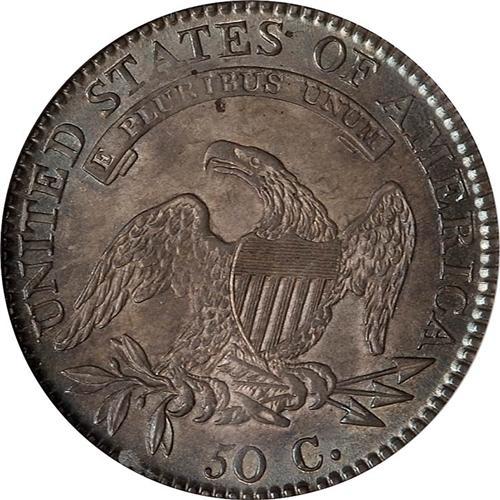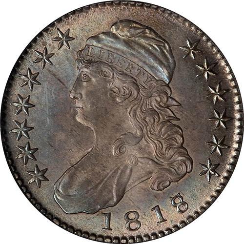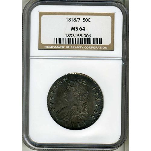 Head of 1812 resumed, 1818/7 First 8 Large, second 8 Over 7 in an extremely well-struck original coin covered in gun metal grey and blue. One of four in this high grade, with only three finer certified makes this choice coin both condition census and Low R7 Extremely Rare in this condition. A real find for either an advanced type or date collector. This over date bids $6250 and trends $9000