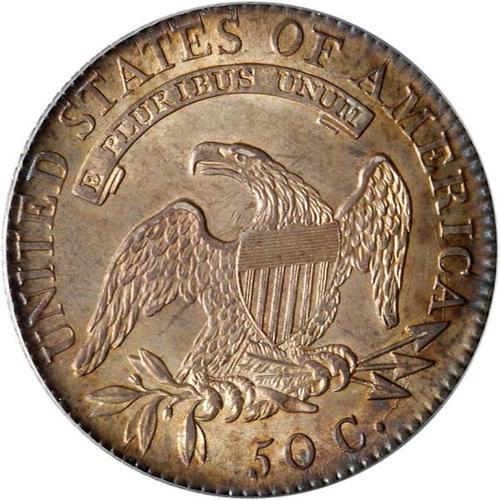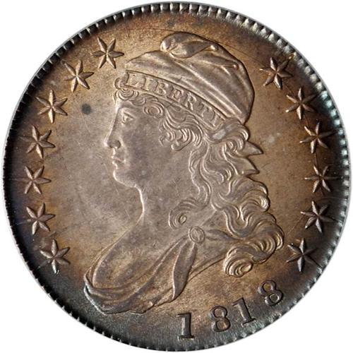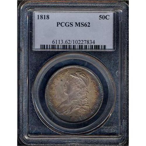 <b>1818 Capped Bust Half Dollar. PCGS graded MS62.</b> Absolutely exquisite toning over fresh, frosty luster, with strong eye-appeal supporting the strong strike on the main devices. Surely worth a premium bid for its beauty <b>(PCGS # 6113)</b> <i>