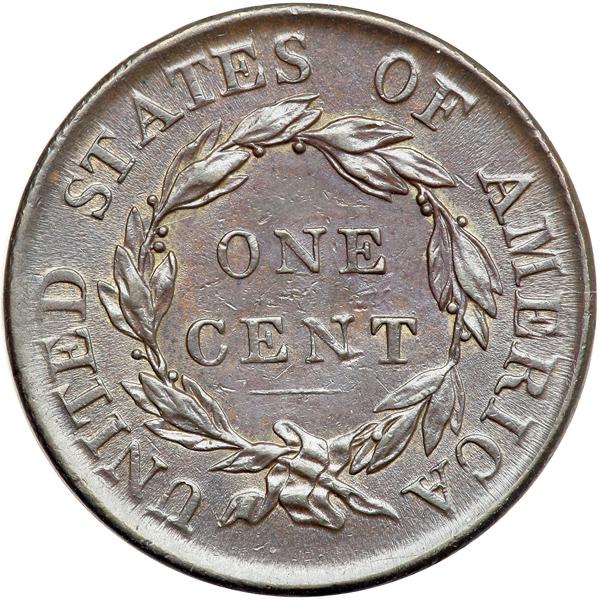1818 Coronet Head Cent. PCGS graded AU-58. Glossy steel brown and chocolate with frosty golden tan in protected areas. No spots, stains, or notable marks. Just light wear on the highest points. MDS with the usual die cracks passing through the date and stars. Most likely from the large group of mint state cents in the Randall Hoard. Our grade is AU55. Pop 1; 3 in 63; 1 in 64. DWH #0469 (PCGS # 36628) .