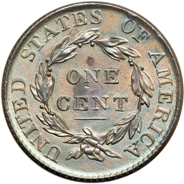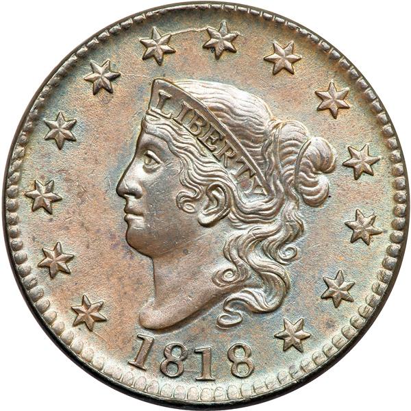 1818 Coronet Head Cent. PCGS graded MS-61 Brown. Lustrous light to medium steel brown with bluish steel toning in protected areas. A small spot of darker olive brown toning above the N in ONE and a small planchet chip under the left foot of that N, as struck, are the notable defects. LDS with a small cud break connecting the O in OF to the rim above. A fine die crack also extends from the tip of the coronet through star 5 to the rim. Our grade is MS60. Pop 1; 1 in 62; 1 in 66. Only 3 graded at PCGS for the variety. DWH #2455 (PCGS # 36619) .