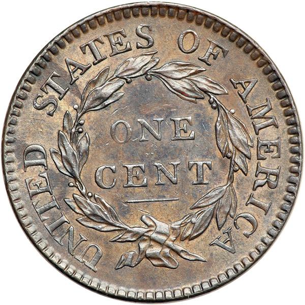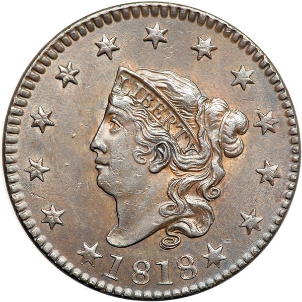 1818 Coronet Head Cent. PCGS graded MS-62 Brown. Glossy steel brown and chocolate with frosty golden light brown in the protected areas plus hints of very faded mint color on the obverse. The only marks are a few tiny ticks on the cheek and in the field off the chin. Sharply struck EDS+. A strong spike extends up from the top of the coronet and a few small lumps show in the field before the face. The reverse is rotated 70 degrees CCW. Called AU55 in the Bland census. Our grade is AU50. Pop 1; 1 in 63. DWH #0449 (PCGS # 36607) .