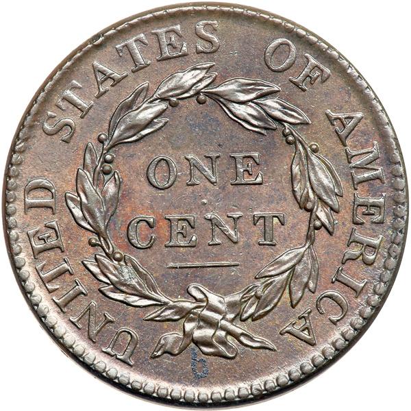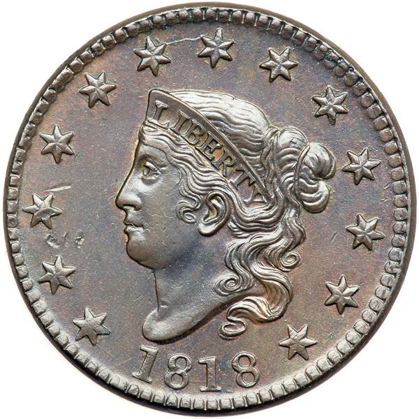 1818 Coronet Head Cent. PCGS graded MS-62 Brown. A mint state cent that has three small, closely spaced nicks over star 2 and a single nick over star 3. Otherwise the surfaces are choice. Glossy bluish steel brown with underlying lustrous very faded mint color peeking through in the fields and a small "6" neatly added in dark ink under the wreath. MDS. The fields are covered with fine radial die flowlines, the die crack that connects stars 6 & 7 is clear, and there is minor die crumbling at stars 5 & 7. The usual die state. Our grade is AU55. Pop 1; 1 in 66. Only 3 graded at PCGS for the variety. DWH #0462 (PCGS # 36619) .