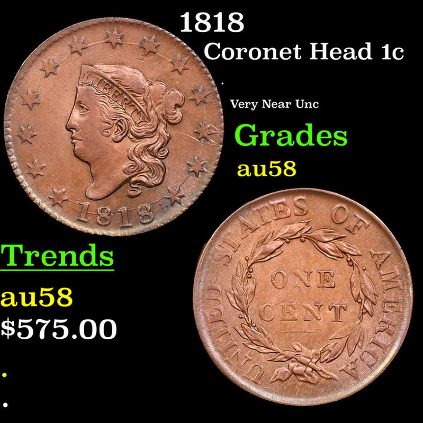 1818 Coronet Head Large Cent 1c Grades Choice AU/BU Slider.