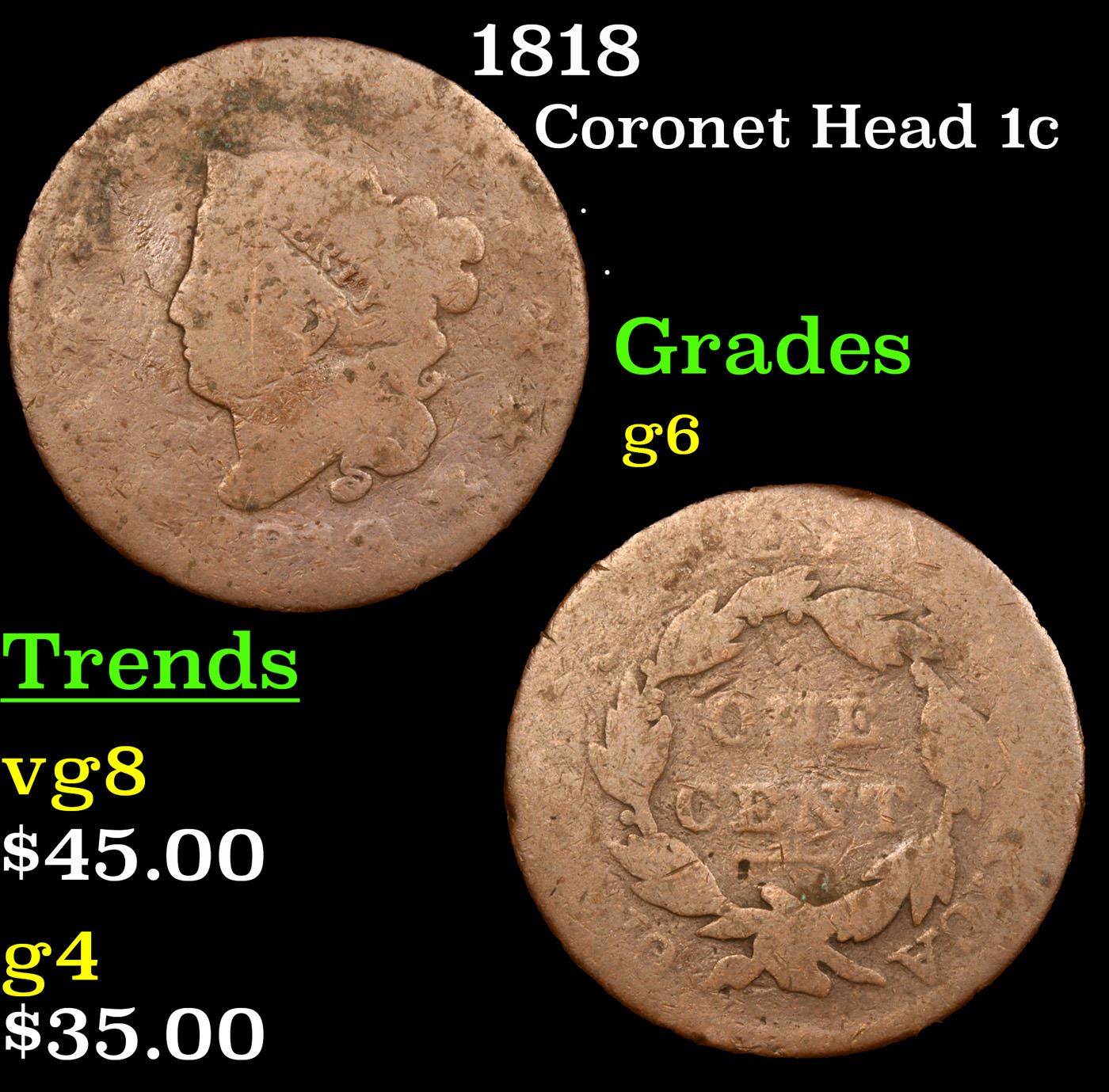 1818 Coronet Head Large Cent 1c Grades g+.
