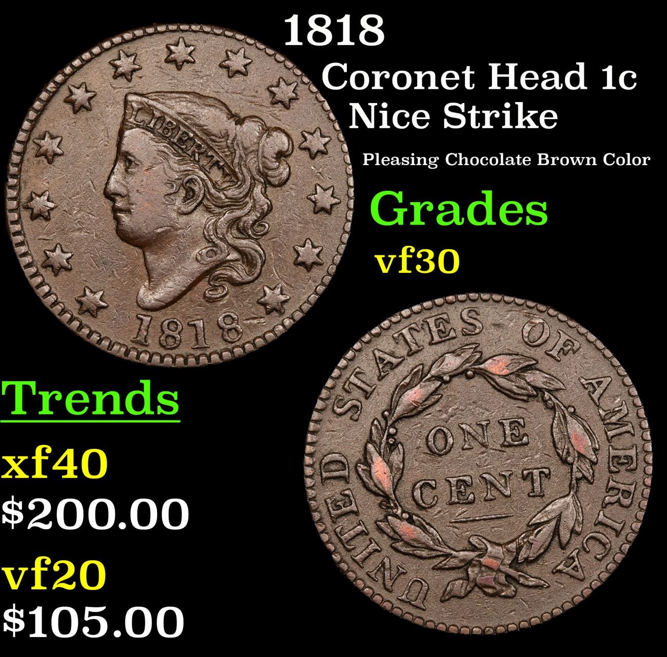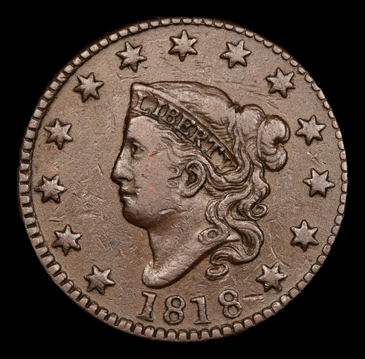 1818 Nice Strike Pleasing Chocolate Brown Color Coronet Head Large Cent 1c Grades vf++.