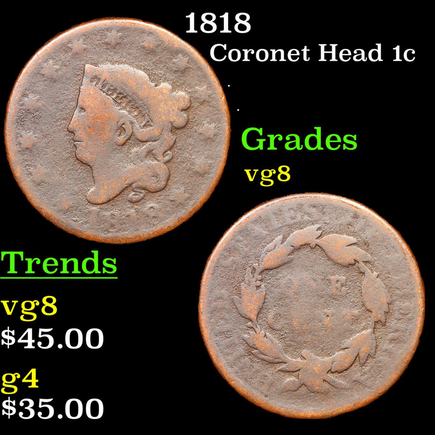 1818 Coronet Head Large Cent 1c Grades vg, very good.