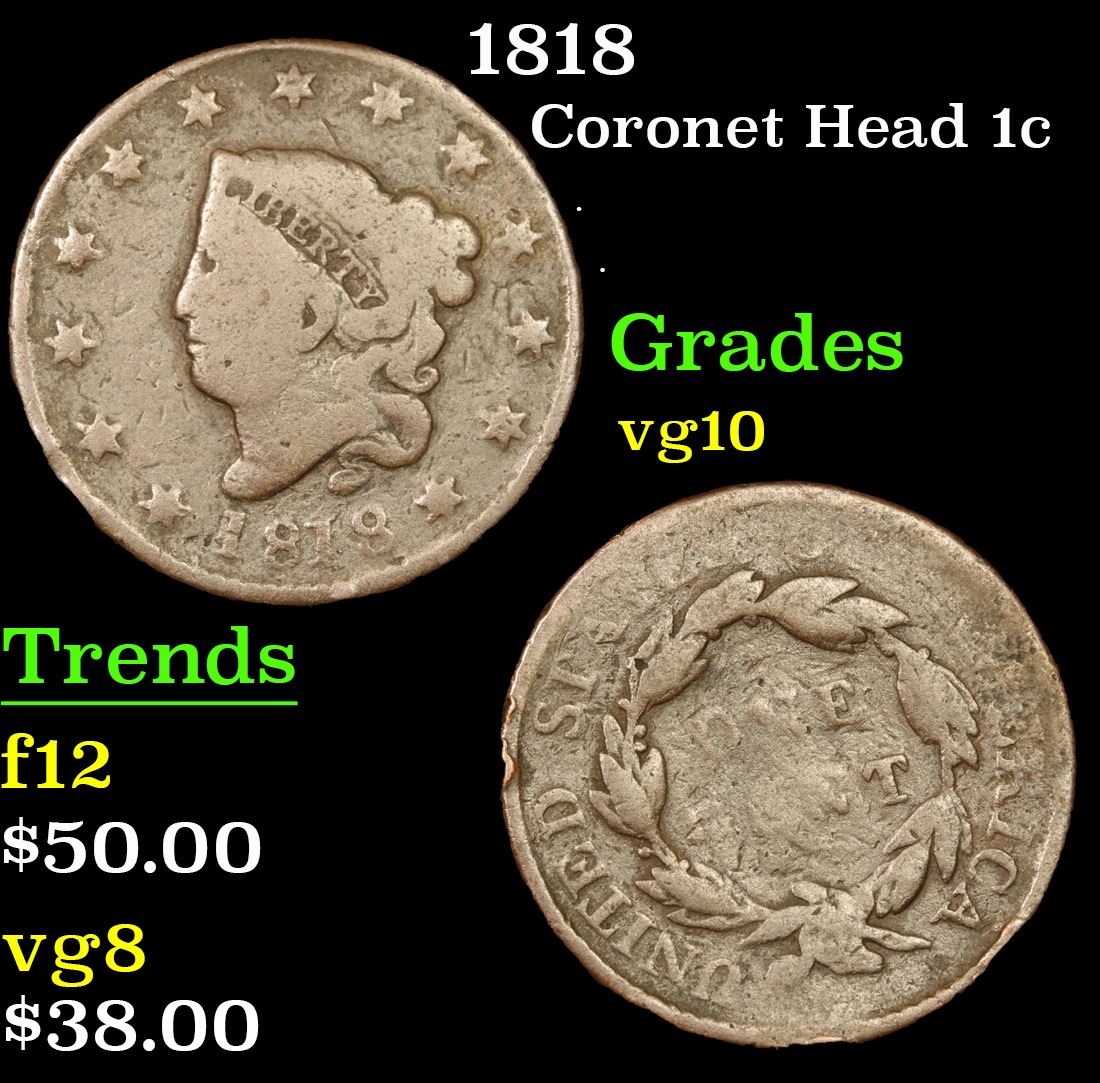 1818 . . Coronet Head Large Cent 1c Grades vg+.