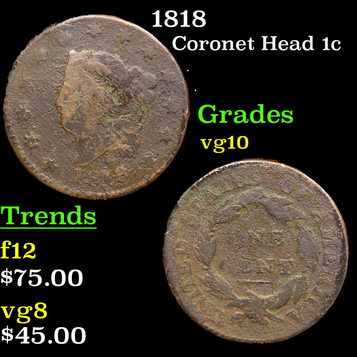 1818 Coronet Head Large Cent 1c Grades vg+.
